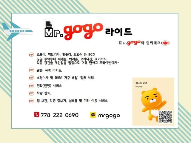 공항라이드 특가 감사세일 작은차량 (미니 부터 시빅 엘란트라 등)최대4명까지 짐 사이즈에따라 최대 4개 다운타운 전지역 35불 큰차량 (소렌토 부터 카니발까지) 최대6명 짐사이즈에따라 최대 5개 50불 다운타운 차량사이즈 인원 짐랑 동일 버나비 노스 작은차 50불 큰차 65불 메트로 작은차40불 큰차55불 로히드 뉴웨스트 작은차 50불 큰차 75불 코퀴센타 작은차 60불 큰차 80불 랭리 윌로비 작은차 70불 큰차 90불 화이트락 작은차 70불 큰차 95불 등 이외지역 연락주세요 지역별 주소별로 약간의 차이가 있을수 있습니다 공항 픽업 드랍가격은 동일합니다